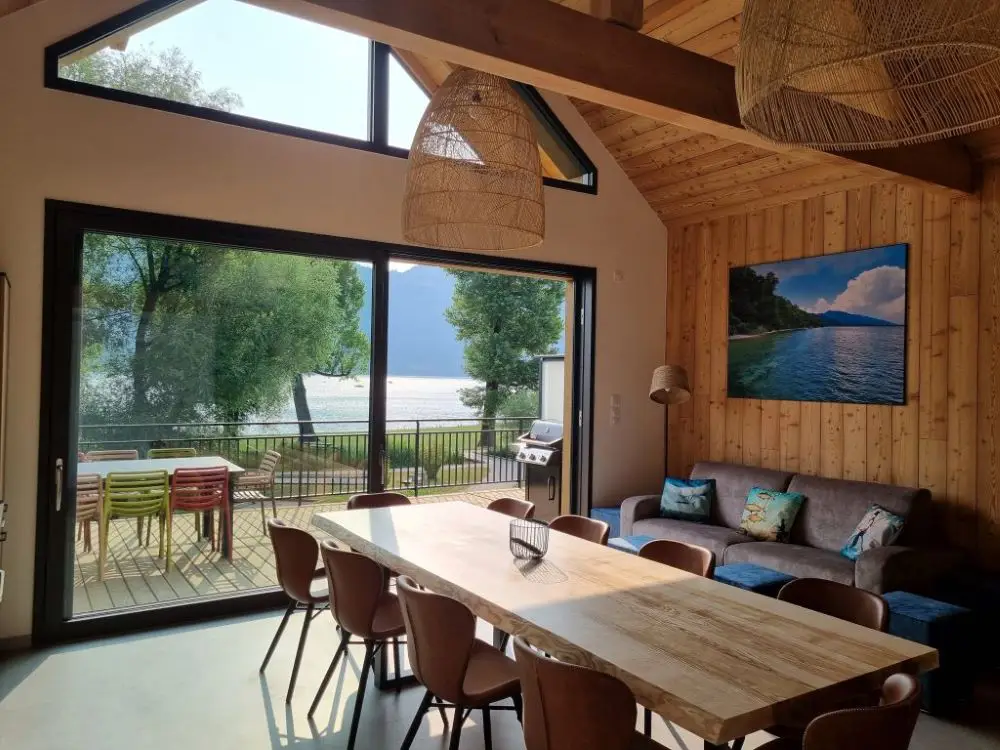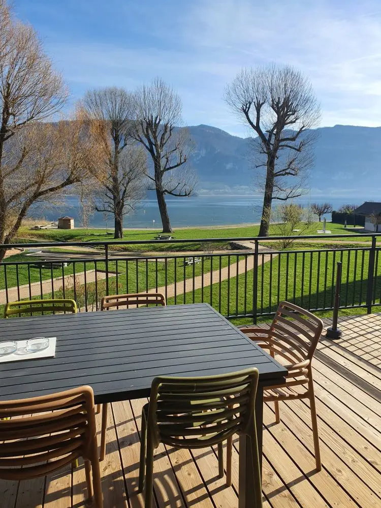 Chaque chalet dispose d'une magnifique terrasse sur pilotis de 30m2 avec grande table, chaises, fauteuils, barbecue et transats. La vue sur le lac, la baie de Conjux et le massif de la Chambotte est exceptionnelle.