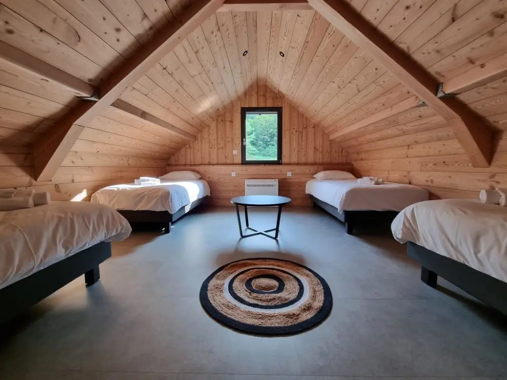 À l'étage, sous les combles, vous trouverez un salon confortable avec TV connectée et un grand dortoir pour 4 personnes.