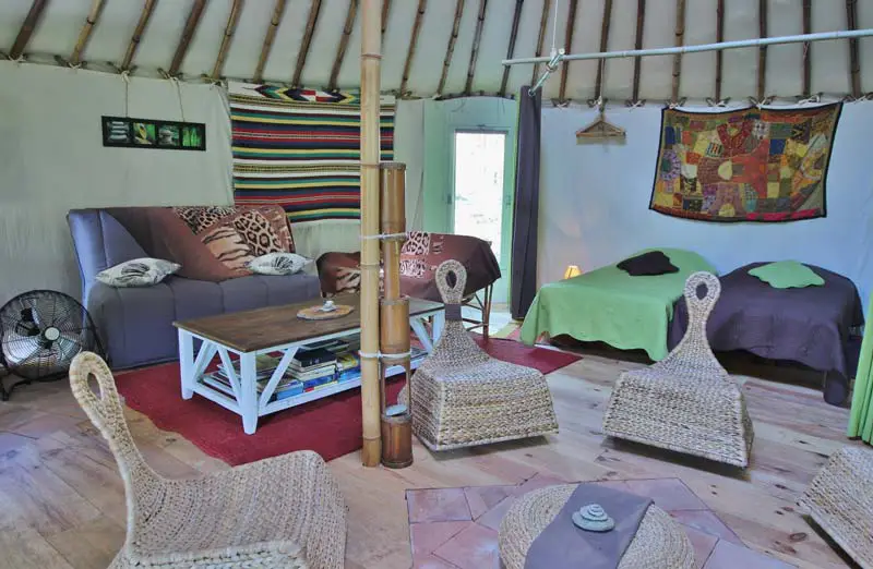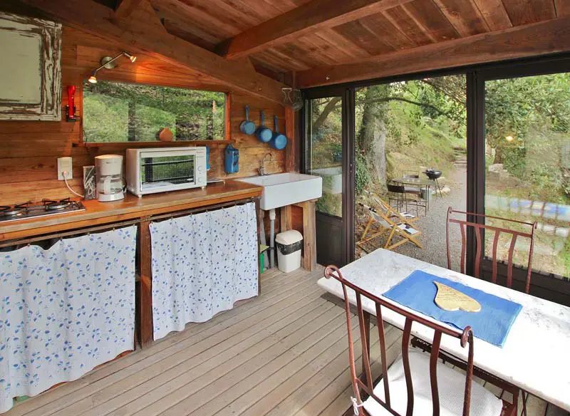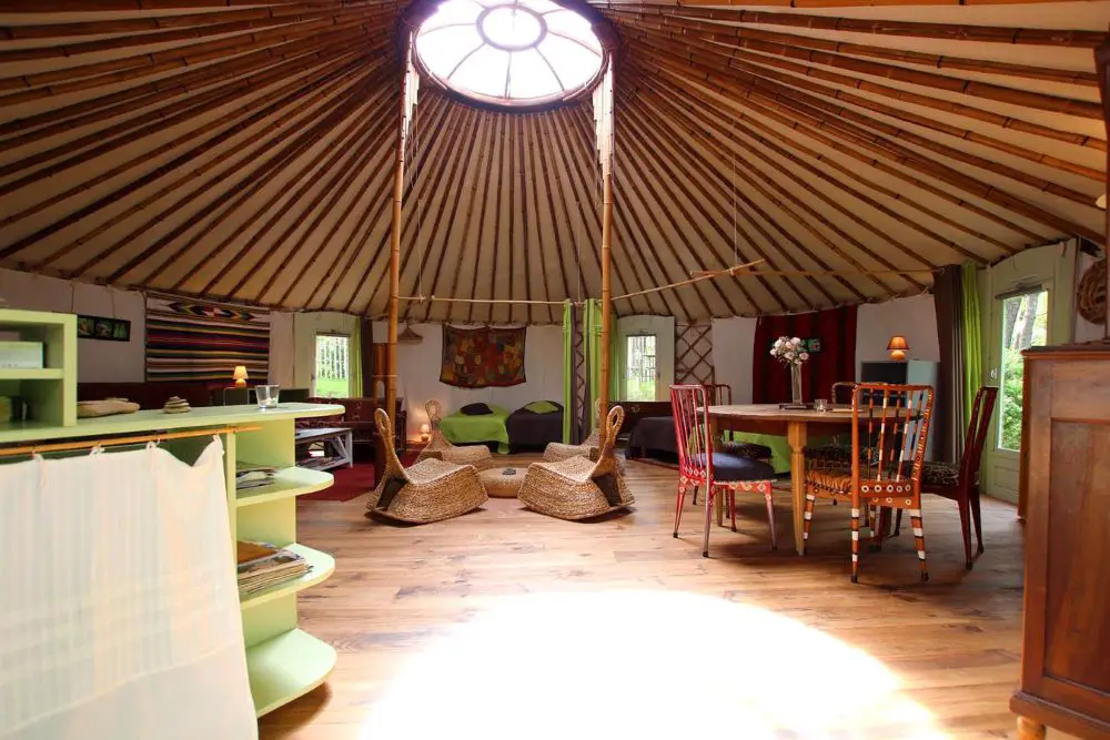 - La yourte de 56m2 dispose de 6 couchages et d’un espace cuisine. Lumineuse, elle surplombe la rivière.