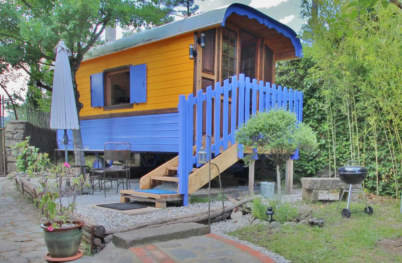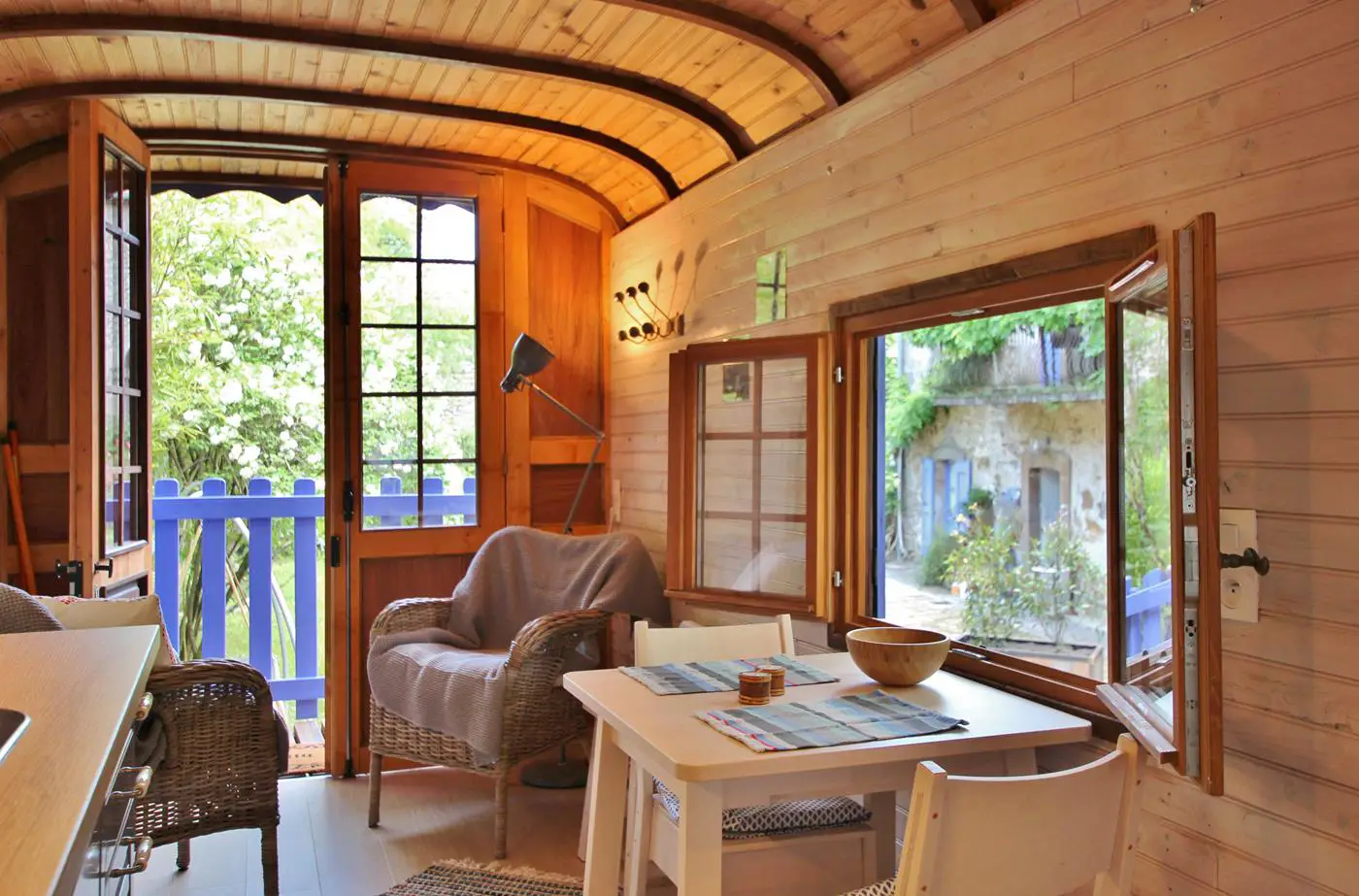 - La roulotte, elle, vous offre un espace cocon pour 2 adultes et un enfant.