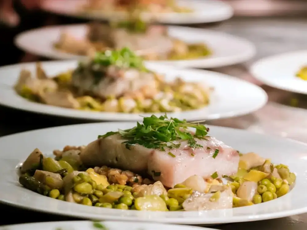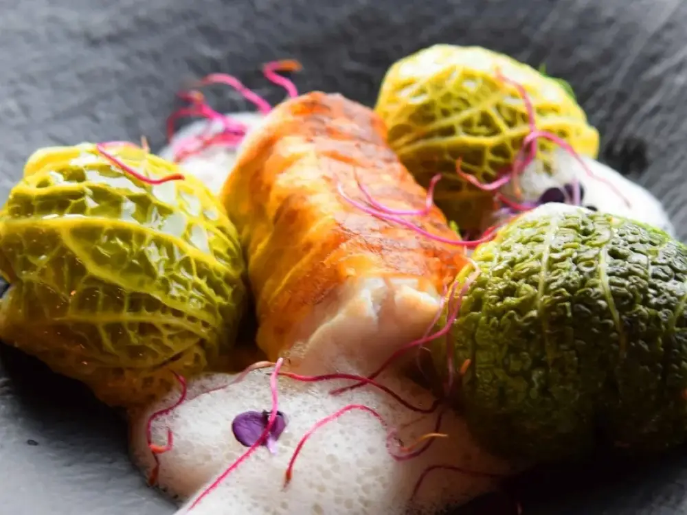 - Plat : Lotte en croûte de crevettes grises, coulis de cresson ou Souris d’agneau confite - Accompagnement de saison.