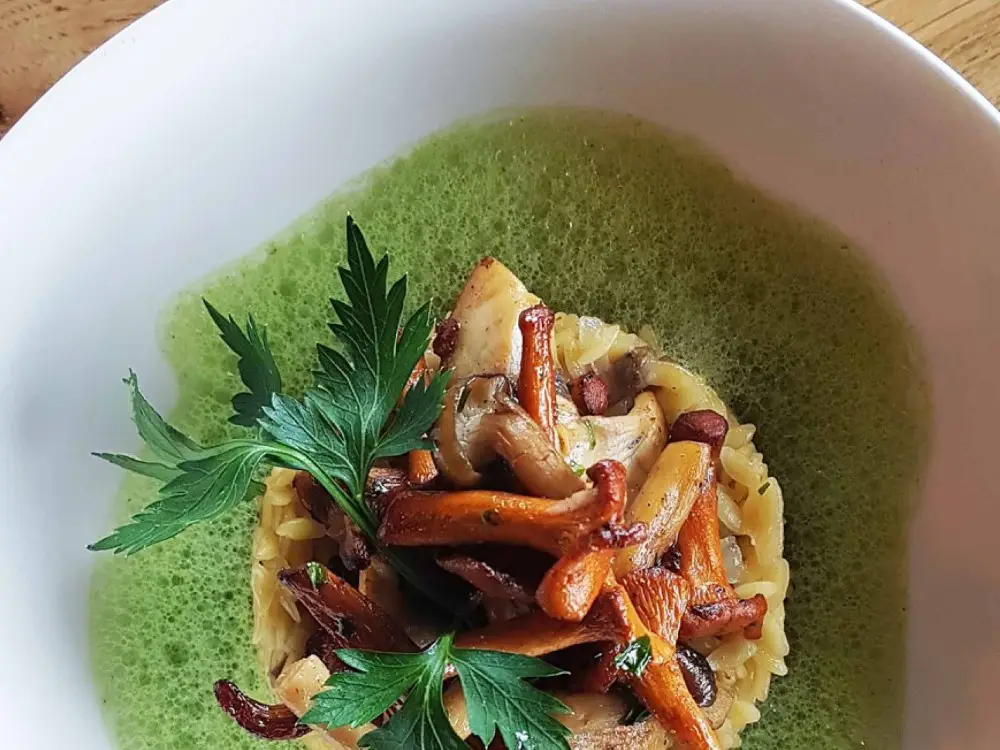 - Entrée : Œuf parfait, purée de topinambour, girolles.