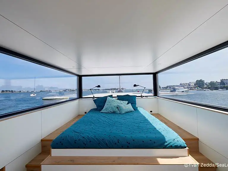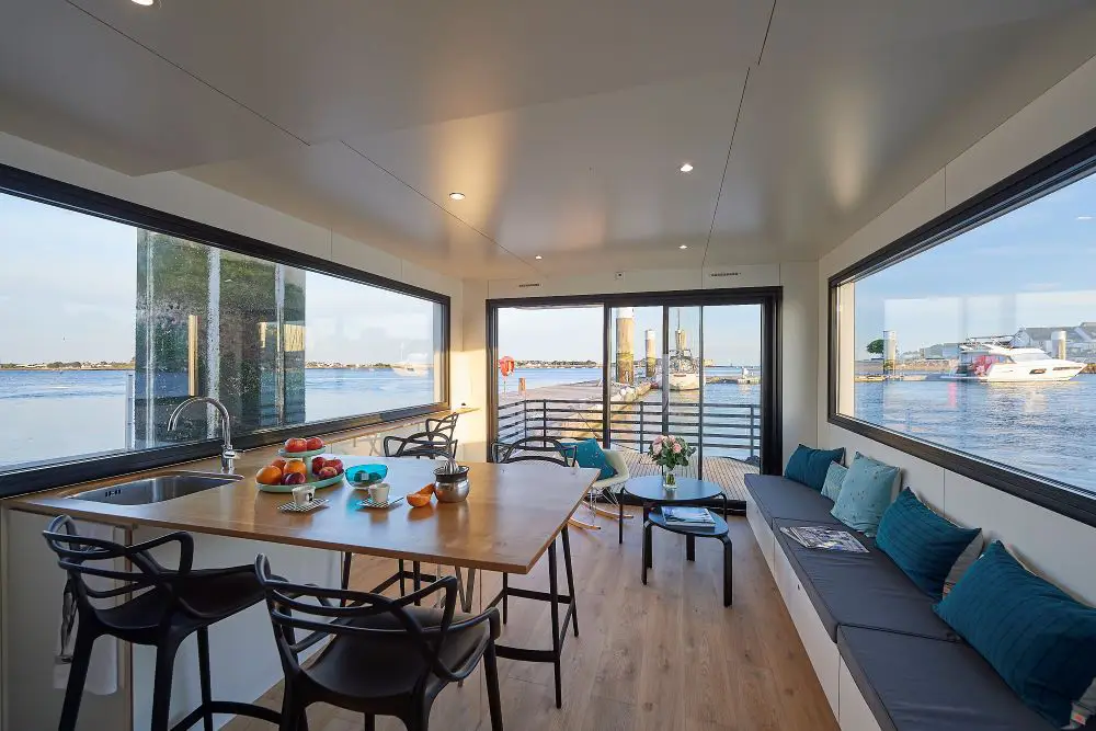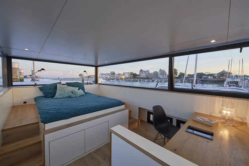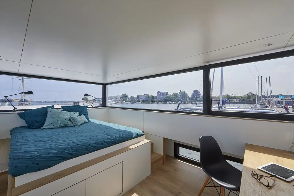 Avec ses 50 m² de surface habitable soigneusement aménagés, cette maison sur l’eau peut accueillir jusqu’à 5 personnes. Tout a été pensé pour optimiser l’espace et garantir votre confort :