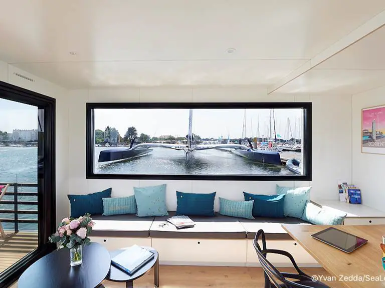 Cette maison flottante est un véritable lieu de vie, mêlant décoration soignée et fonctionnalité. Depuis votre terrasse, laissez-vous émerveiller par le spectacle permanent de la rade de Lorient : les jeux de lumière du soleil sur l’eau, les catamarans et voiliers dansant au rythme des marées.