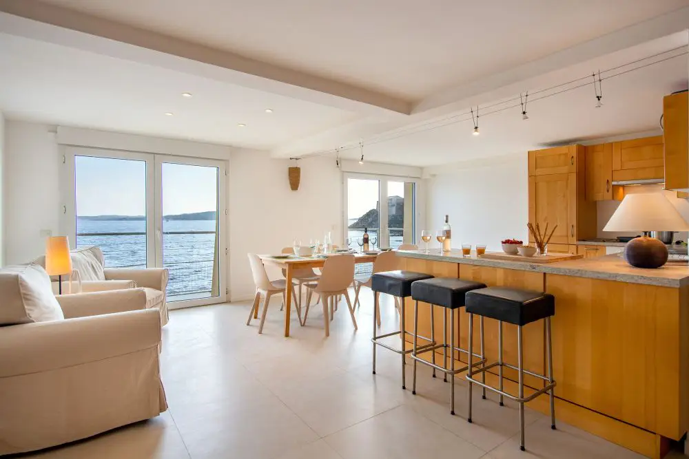 Vous ne pourrez décrocher votre regard des fenêtres pour contempler le va et vient des navettes pour l’île ou les voiliers qui s’amarrent sous vos yeux, bref une vue idyllique sans bouger de votre fauteuil.