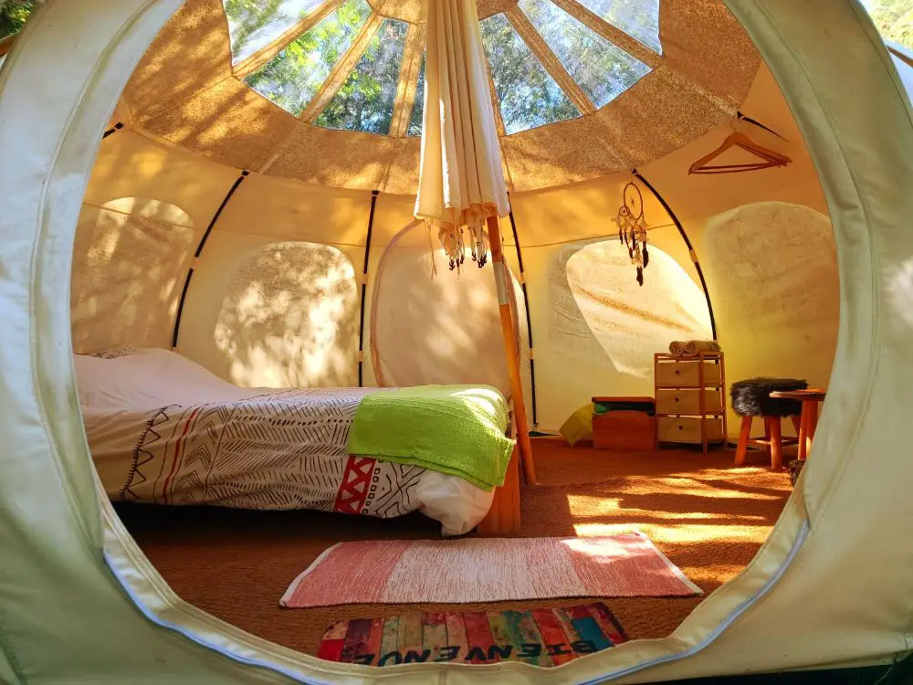 Vous aurez le choix de planter votre tente ou de séjourner dans une cabane en bois ou dans une châtaigne insolite, tente de luxe entre la yourte et le tipi qui peuvent accueillir entre 2 et 6 personnes suivant les modèles.