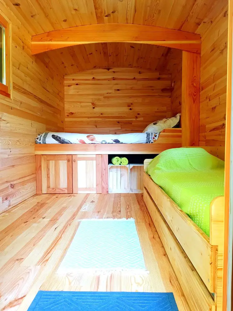 Chaque location est aménagée sur mesure avec du mobilier en bois, une literie confortable et écologique avec des matelas latex en 160. Des tables de pique-nique sont organisées autour d'une cuisine commune toute équipée pour des moments conviviaux (frigo, gaz, four, couverts...). Un espace détente équipé de hamacs vous invite à vous détendre à l’ombre d'un grand platane.