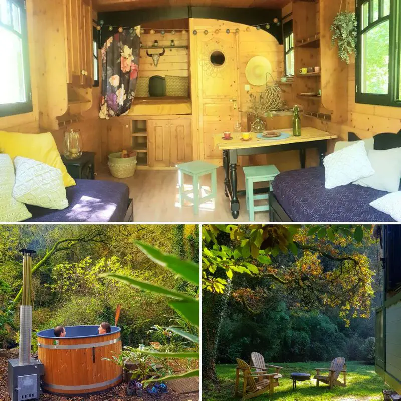 Cette roulotte bohème dans son cadre bucolique, vous accueille pour un séjour en amoureux ou en famille. Elle propose un lit double en alcôve et jusqu’à trois couchages supplémentaires en lits gigognes. Vous pourrez également y passer une ou plusieurs nuits en totale indépendance puisque qu’elle dispose également d’une douche, de toilette sèche et d’une kitchenette.