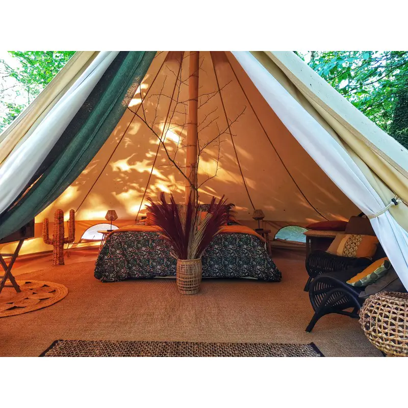 Une tente spacieuse de 20 m2 avec un vrai lit de 160, un sanitaire privatif avec douche et toilettes sèches.