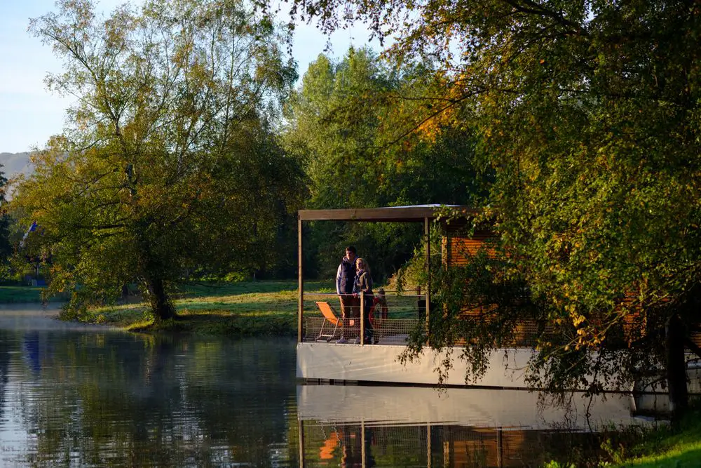 Les 2 maisons flottantes de 30m2 pour 5 personnes sont posées sur un étang en plein coeur du domaine. Vous profiterez de la terrasse pour admirer le lever du soleil ou taquiner le poisson.