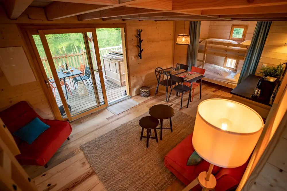 Au rez de chaussée, vous découvrirez un grand salon et des toilettes sèches ainsi qu’un lit superposé en alcôve et un fauteuil convertible.