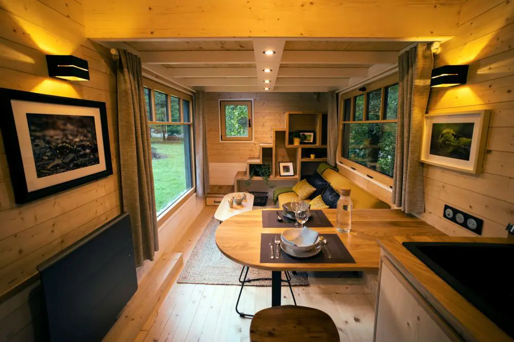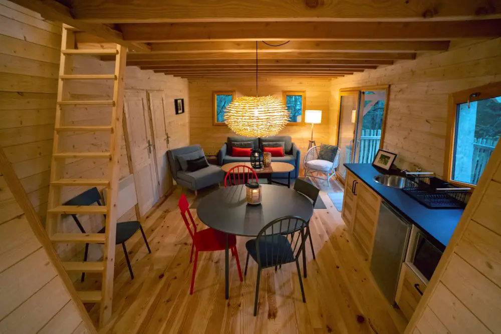 Osez l’expérience tiny house, astucieusement agencée, elle est constituée d’un espace repas – salon, une salle d’eau (douche, lavabo et toilettes eau) et d’une chambre en mezzanine.
