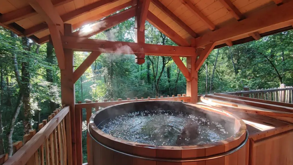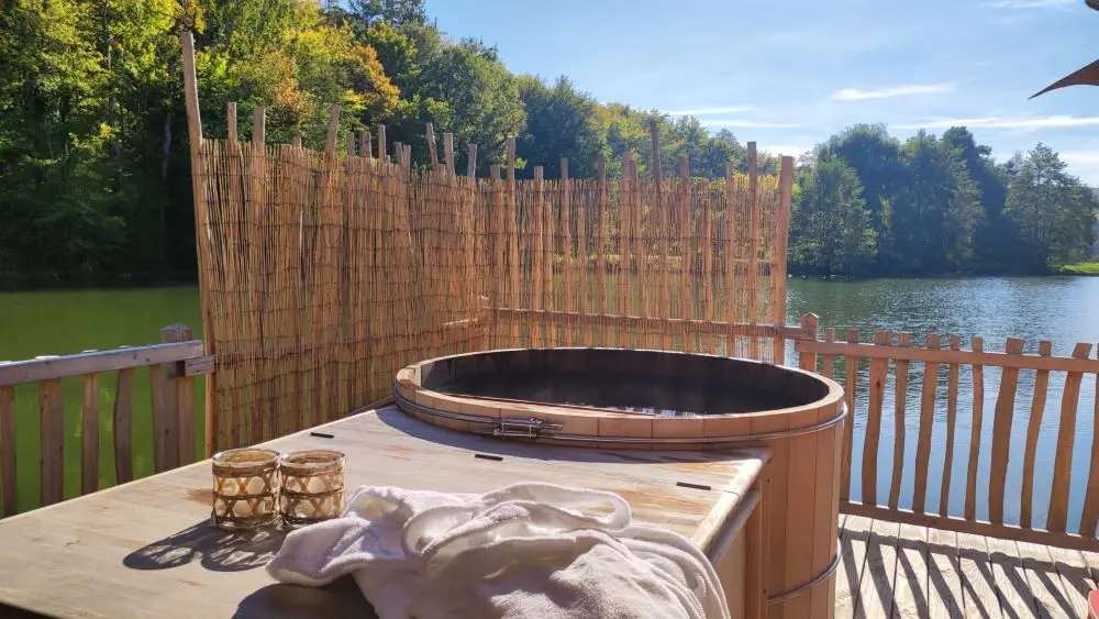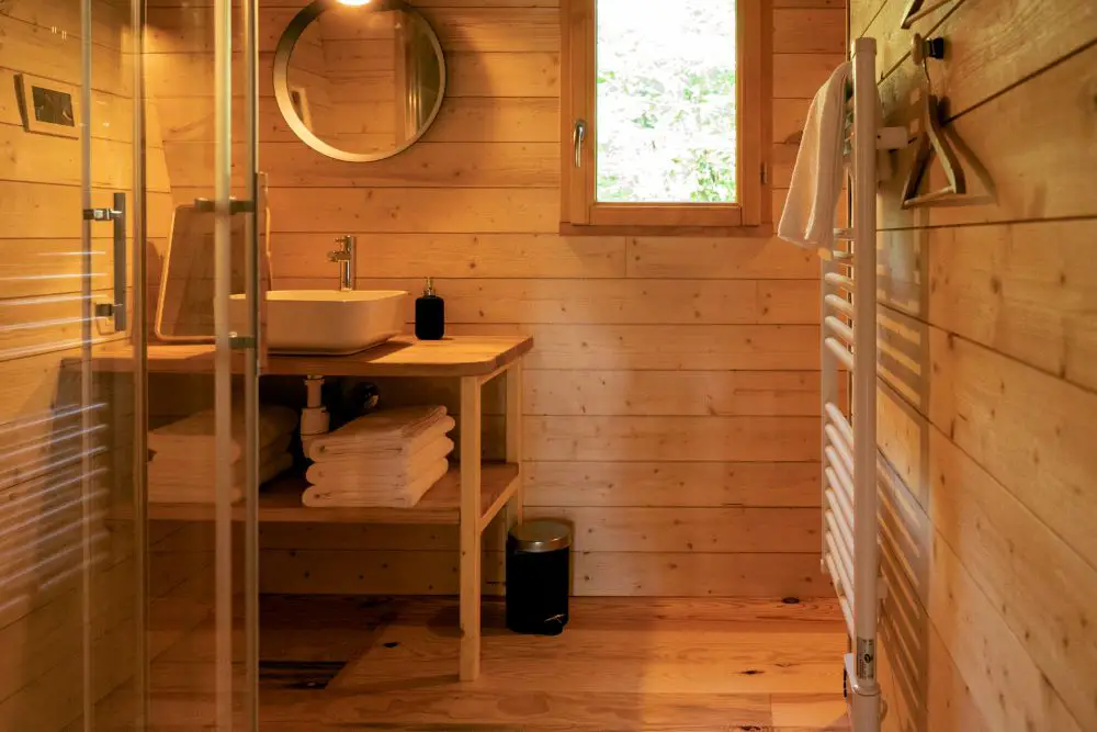 La cabane dispose d’une salle d’eau (douche à l’italienne, lavabo et toilettes eau) et sous son auvent, le bain nordique.