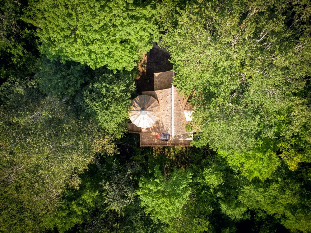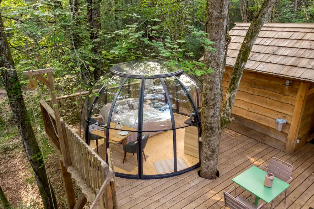 Le dôme perché spa pour 2 pers. est une plateforme de 40m2 nichée dans les arbres à 6m du sol.