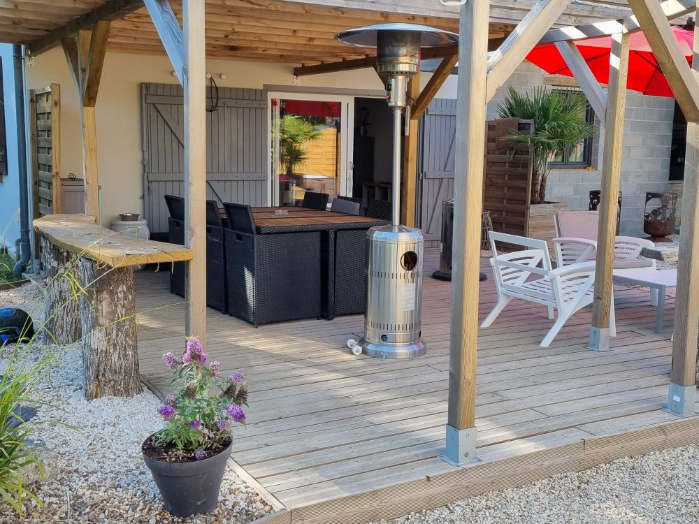 Le gîte de plain-pied peut accueillir 4 personnes. Complètement rénové, il est moderne et très bien équipé. La pièce principale comprend une cuisine ouverte sur le salon doté d'une belle cheminée, 2 chambres et une salle de douche. La terrasse dispose d'un barbecue et d'un bassin d'ornement et d'un spa privatif.