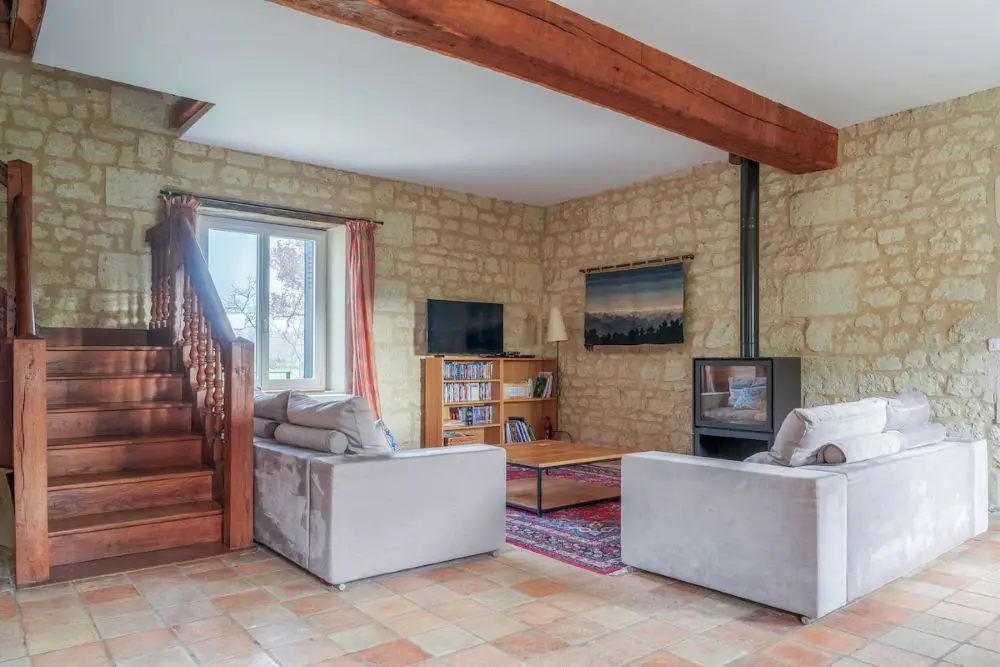 - Un vaste salon avec poutres apparentes, poêle à bois, télévision et wifi fibre.