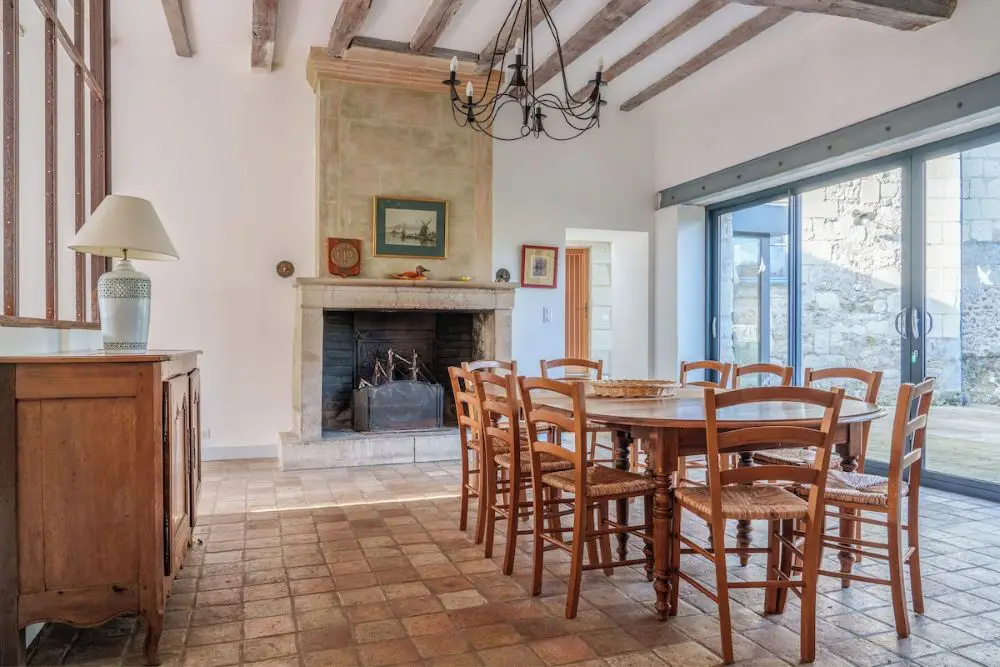 - Une salle à manger avec cheminée ouverte, pouvant accueillir jusqu’à 10 convives.