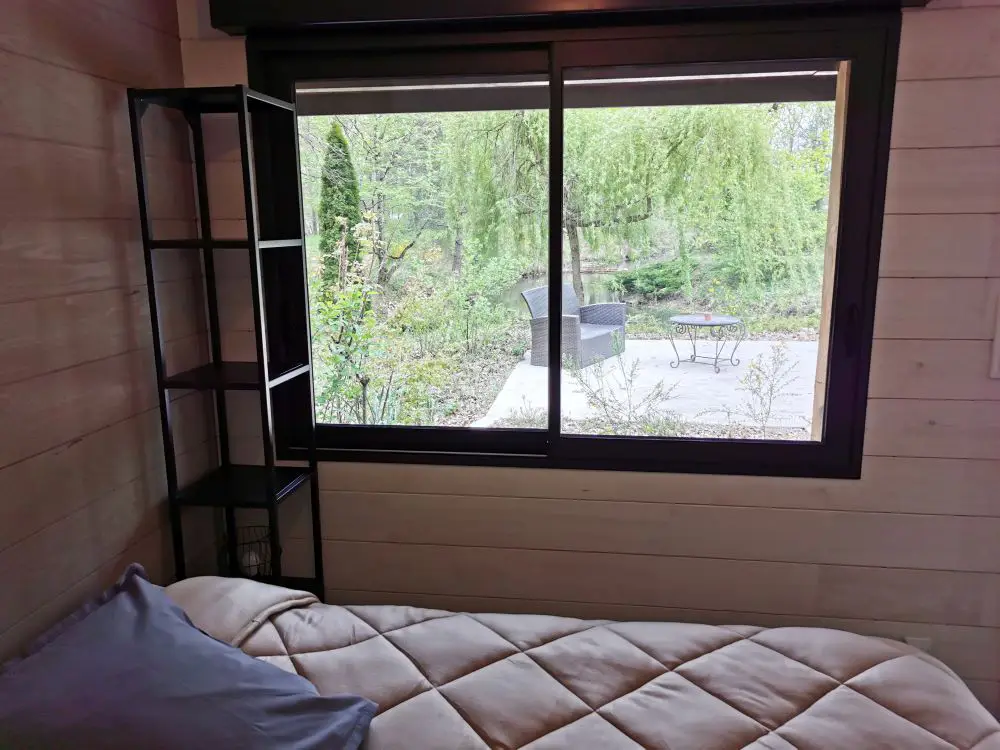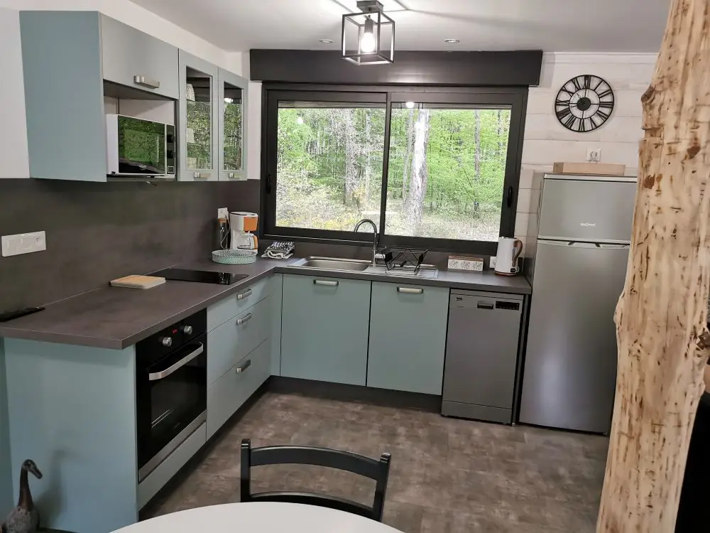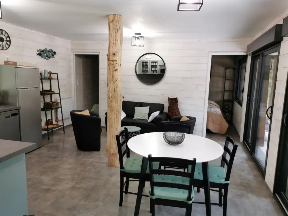 Le Chalet de l'Étang peut accueillir jusqu'à 4 personnes. La pièce à vivre, baignée de lumière grâce à deux grandes baies vitrées, comprend une cuisine ouverte entièrement équipée, un espace repas convivial et un salon.