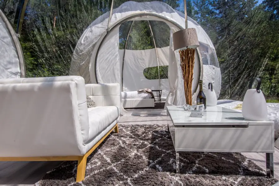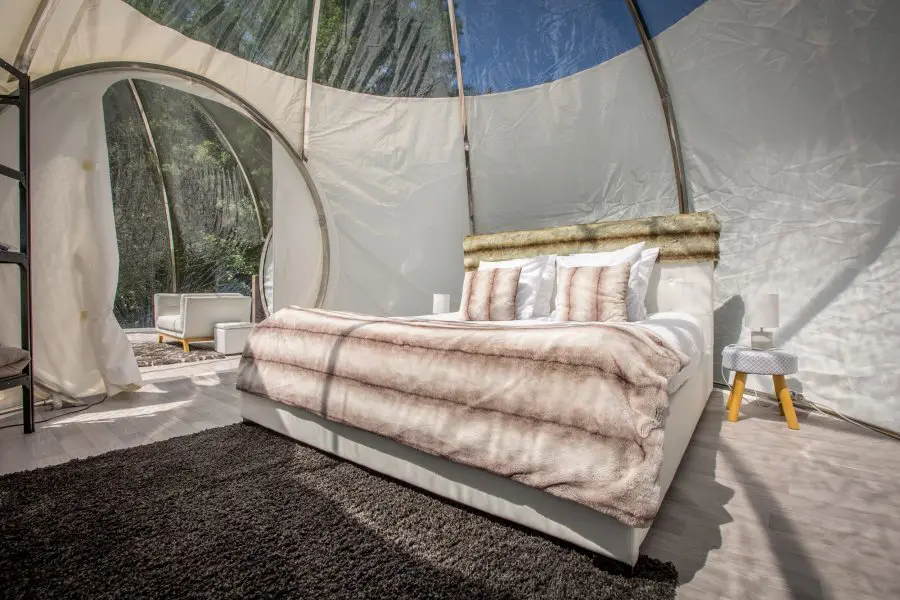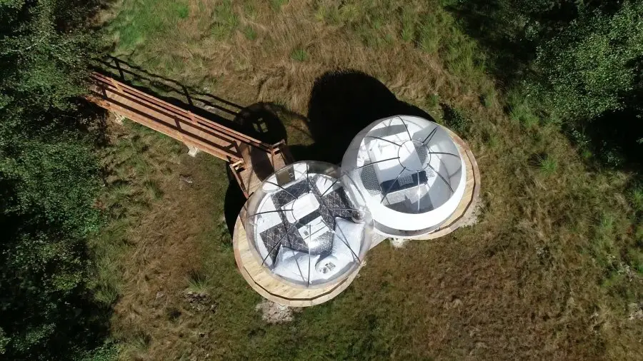 Une double bulle suite de 40m² sur pilotis au bord de l'eau, avec d'un côté un salon ouvert à 360° et de l'autre un espace nuit pour profiter de votre king size sous les étoiles.Tout est prévu pour votre confort : machine expresso, une salle de bain privée avec peignoirs, chaussons, produits d'accueil éco-bio, deux vélos, petit réfrigérateur ... et la climatisation réversible.