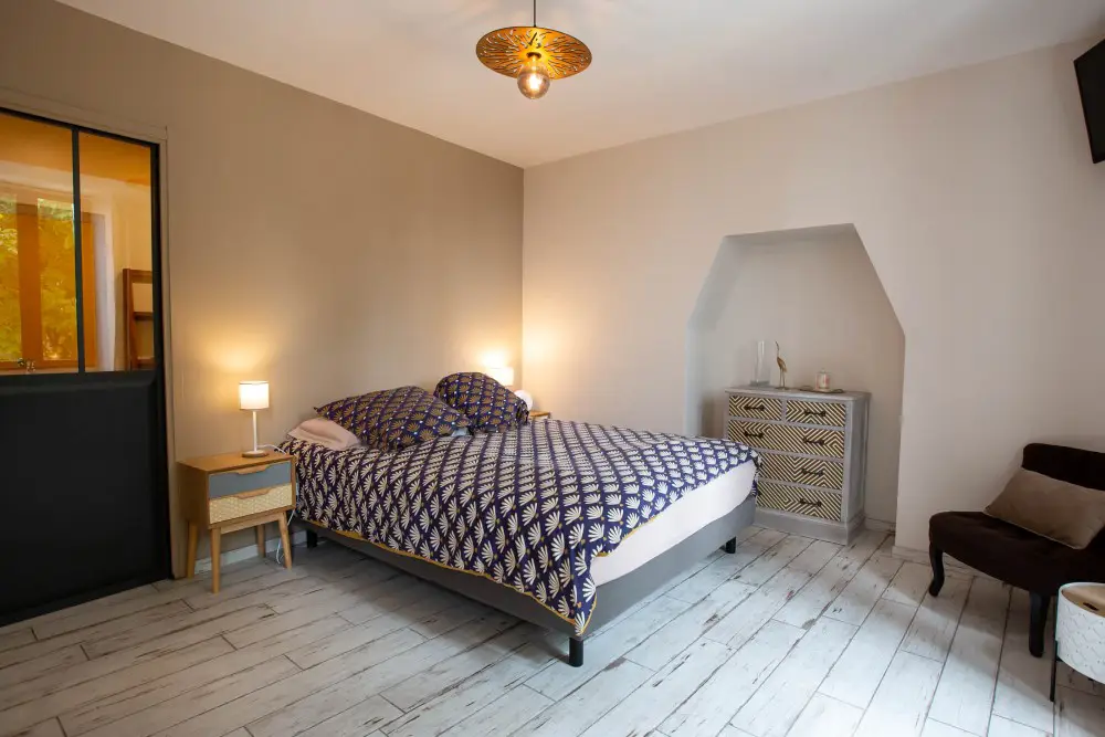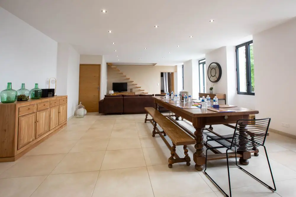 La décoration marie avec élégance le style contemporain et des touches personnalisées, créant une atmosphère à la fois authentique et raffinée. Les vastes espaces communs invitent à la convivialité et à la détente, tandis que les chambres, toutes pourvues de leur propre salle de bain, garantissent confort et intimité à chaque invité.