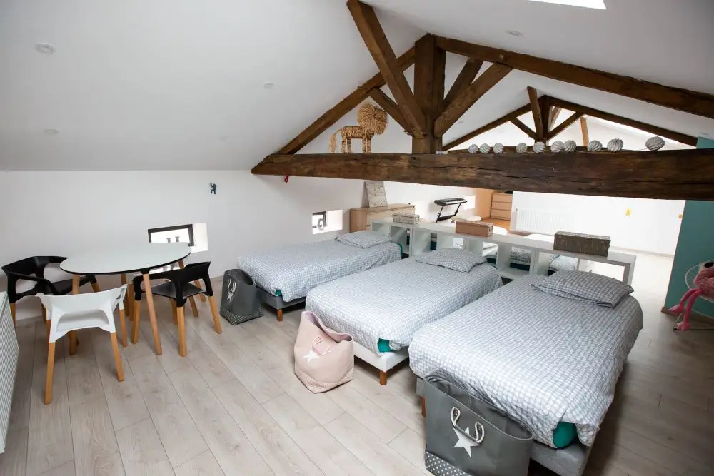 Le logement, aménagé avec soin par Anne et son mari, se compose de cinq grandes chambres, dont une au rez-de-chaussée spécialement adaptée pour les personnes à mobilité réduite et quatre autres au premier étage. De plus, un dortoir situé au deuxième étage a été spécialement imaginé pour accueillir les jeunes générations, créant ainsi un espace ludique et convivial pour les enfants.