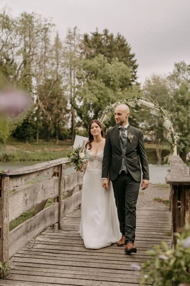 Cocktail en plein air, cérémonie laïque face aux étangs, dîner sous chapiteau…chaque moment trouve naturellement sa place.