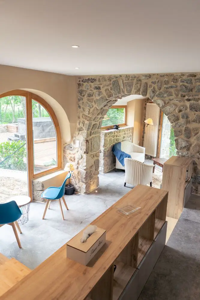 Ainsi, c’est bien dans cet esprit de partage et d’évolution symbolisé par le moulin et la chapelle d’antan que nous avons pensé et rénové cette maison de pierres polychromes ! Création de grandes ouvertures et de parties vitrées, sablage et rejointoiement du granit, peinture à la chaux et couleurs tempérées, mais aussi une recherche tout en douceur des éclairages pour des soirées à l’ambiance tamisée.