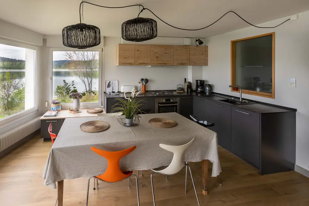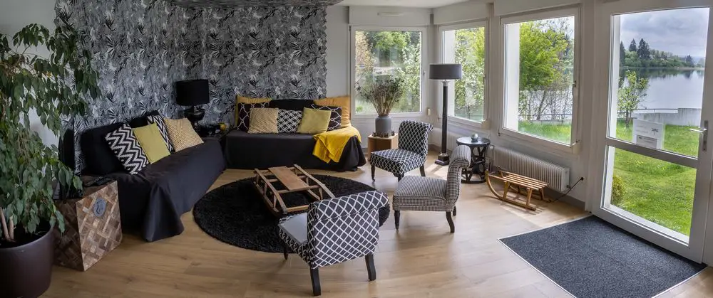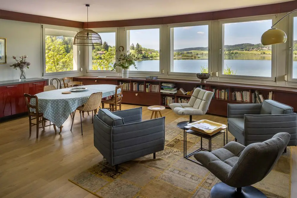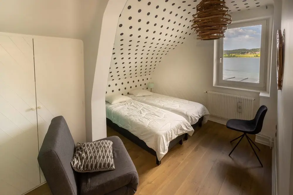 J’ai de suite été séduite par l’emplacement privilégié de la maison à l’écart du tumulte et par la lumière pénétrante qui diffuse une douce chaleur derrière les larges fenêtres. Le jardin donne sur le lac et la vue est juste magnifique. Barbecues et bronzette l’été, pêche et ski l’hiver, en toute saison ce gîte vous promet de merveilleuses vacances actives ou ressourçantes. Pour les couples ou petites familles 4 pers, vous avez aussi la cabane, un petit chalet à fleur d’eau à quelques mètres de là.
