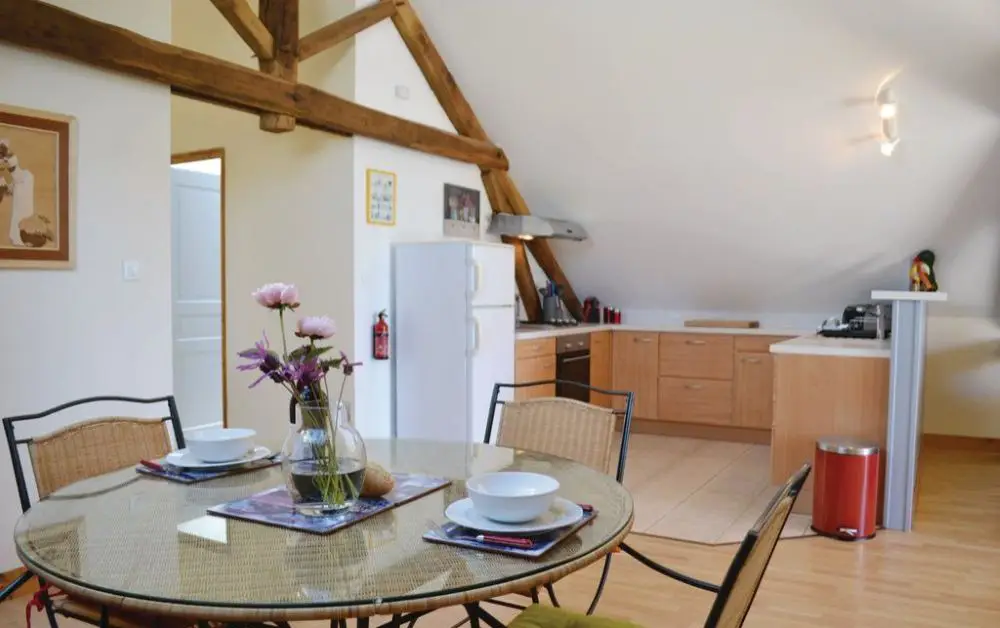 Le gîte des Rosiers (4 personnes) est situé à l’étage. Il comprend deux chambres avec lits doubles, une salle d’eau, toilettes, un grand séjour de 31 m² avec cuisine ouverte (plaque de cuisson, réfrigérateur/congélateur, four, micro-ondes), et un balcon privatif avec vue sur le parc. Climatisé, il dispose d’un salon de jardin, d’un barbecue à gaz et du Wi-Fi. TV