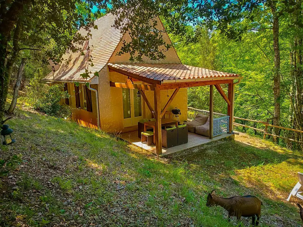 Un peu plus haut, à l’ombre des chênes verts, empruntez les sentiers et découvrez trois maisonnettes traditionnelles de style périgourdin qui se fondent dans la forêt. Chacune d’environ 60 m², bien espacée des autres, offre une ambiance rustique et confortable. À 50 mètres seulement de l’étang et de la piscine, elles sont adaptées aux familles. Et au détour d’un sentier, quelques chèvres curieuses viennent saluer les visiteurs.
