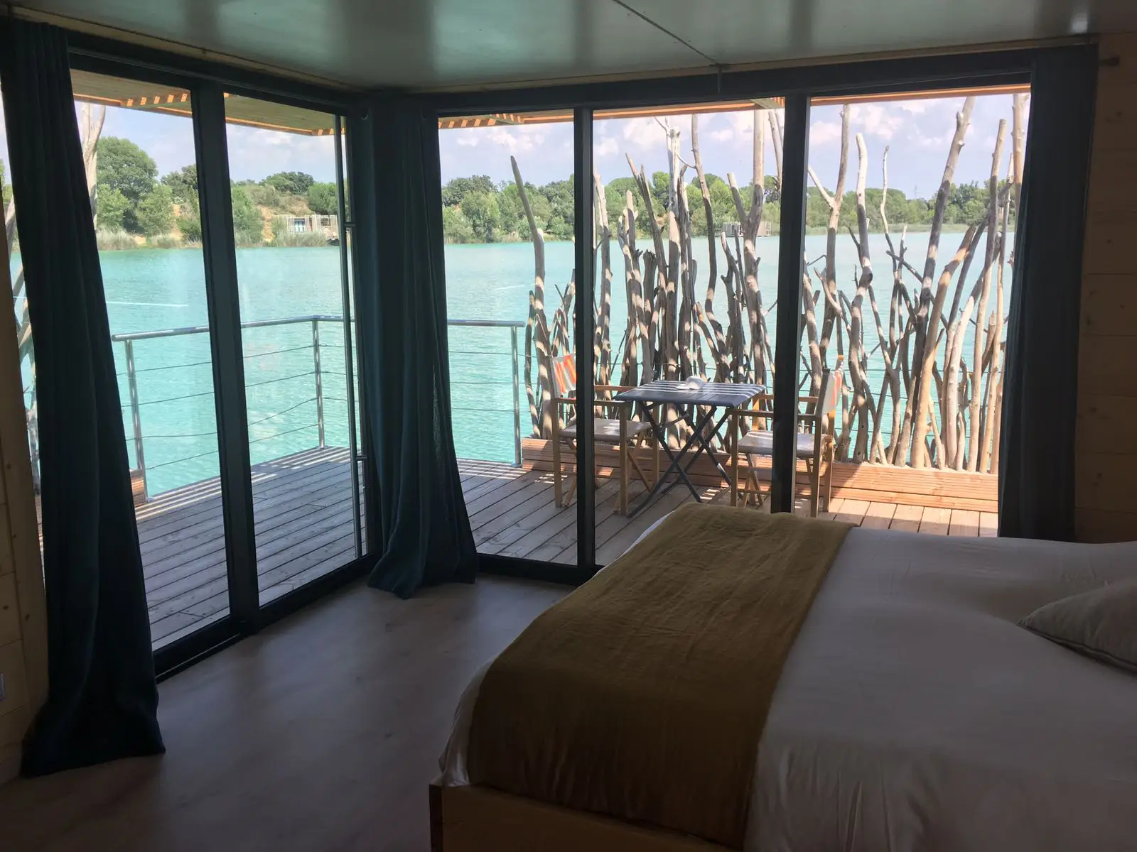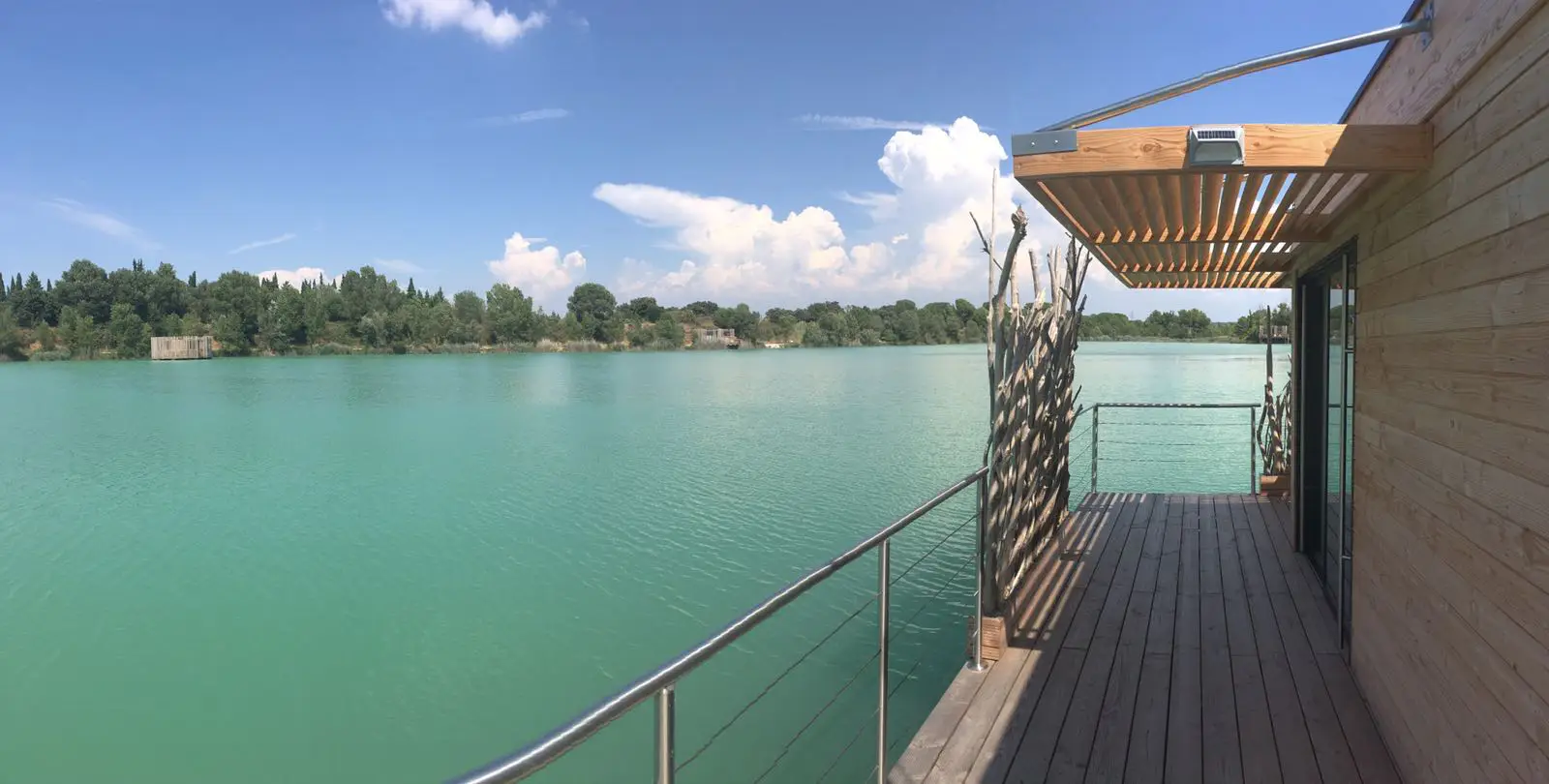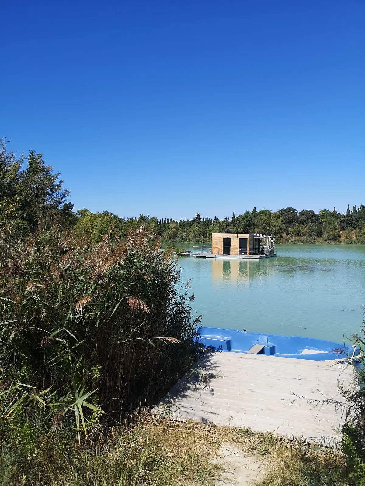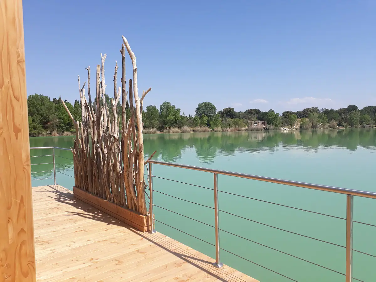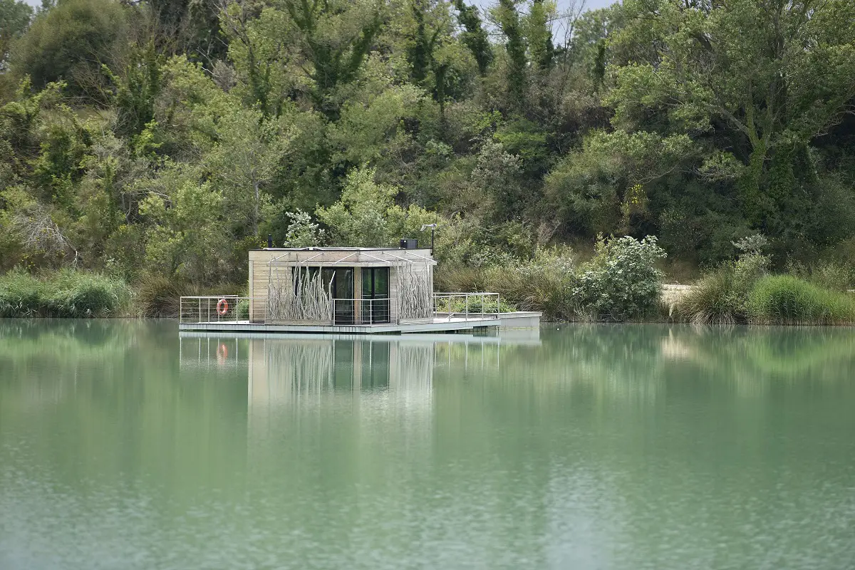 Située à 40m de la rive, la cabane Utopie est accessible en barque. Une fois arrivé, vous découvrirez un cocon aménagé avec soin pour y vivre un moment unique de déconnexion. La cabane est équipée d’une salle de bain fonctionnant avec un système de récupération d’eau, de toilettes et douche traitées par une phytoépuration flottante agréée et d’électricité produite par des panneaux solaires. D'autres cabanes amarées sur l'eau et des cabanes sur pilotis sont posées au bord du lac pour les amoureux et les familles.