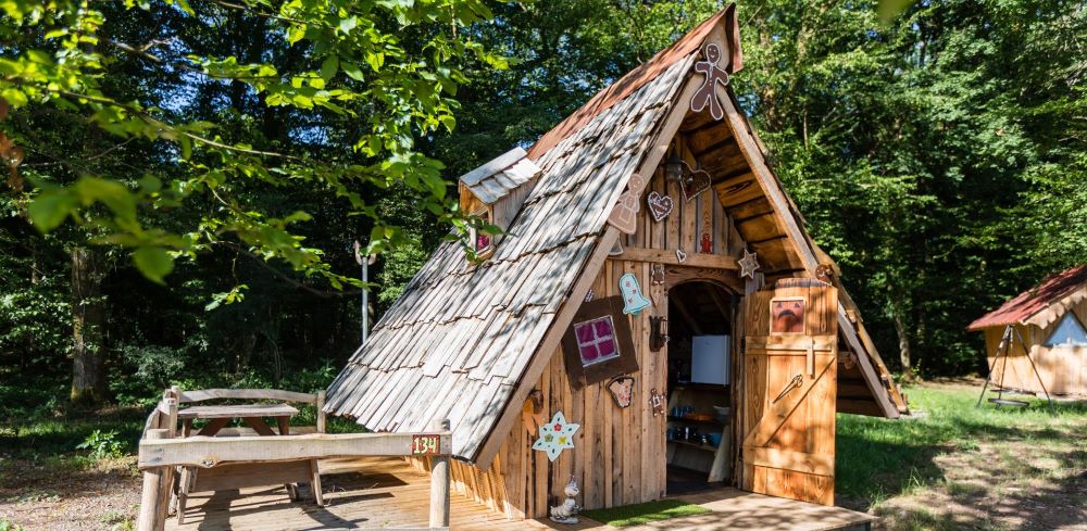 Cette cabane représente la maison des parents d'Hansel et Gretel. Coin cuisine, coin repas, 3 coins chambres avec un lit double séparé par des cloisons et rideaux, et deux lits superposés séparés par des rideaux. Une terrasse couverte équipée d’un salon de jardin et barbecue. Semaine à partir de 450 € |