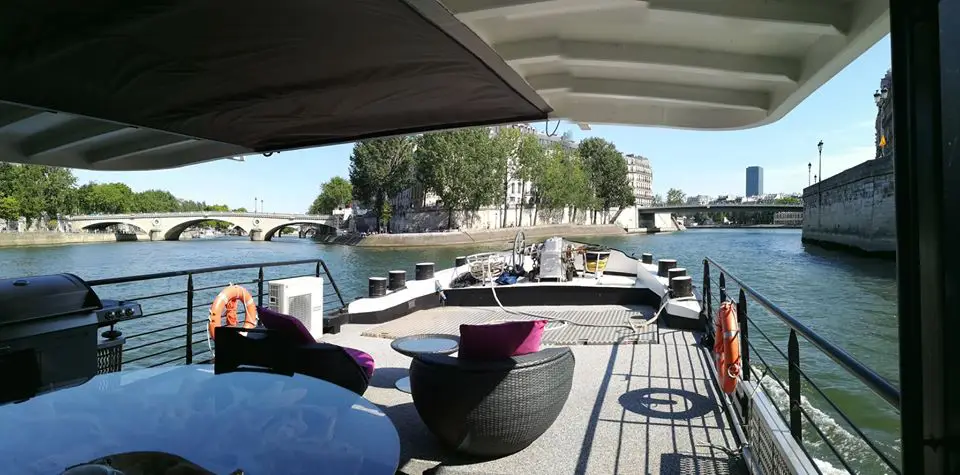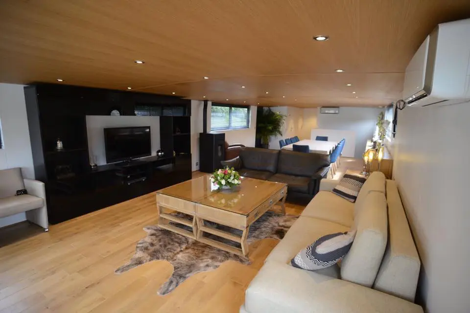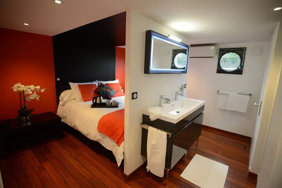 La péniche, entièrement climatisée, peut accueillir 8 à 10 passagers logés dans des cabines luxueuses et confortables équipées chacune de sa propre salle d'eau avec toilettes. Pour les espaces communs, vous vous retrouverez dans le salon/salle à manger spacieux et lumineux de 60 m², et sur la terrasse de 50 m² avec une partie couverte, pour des déjeuners à l’ombre ou tout simplement pour profiter du pont par tous les temps.